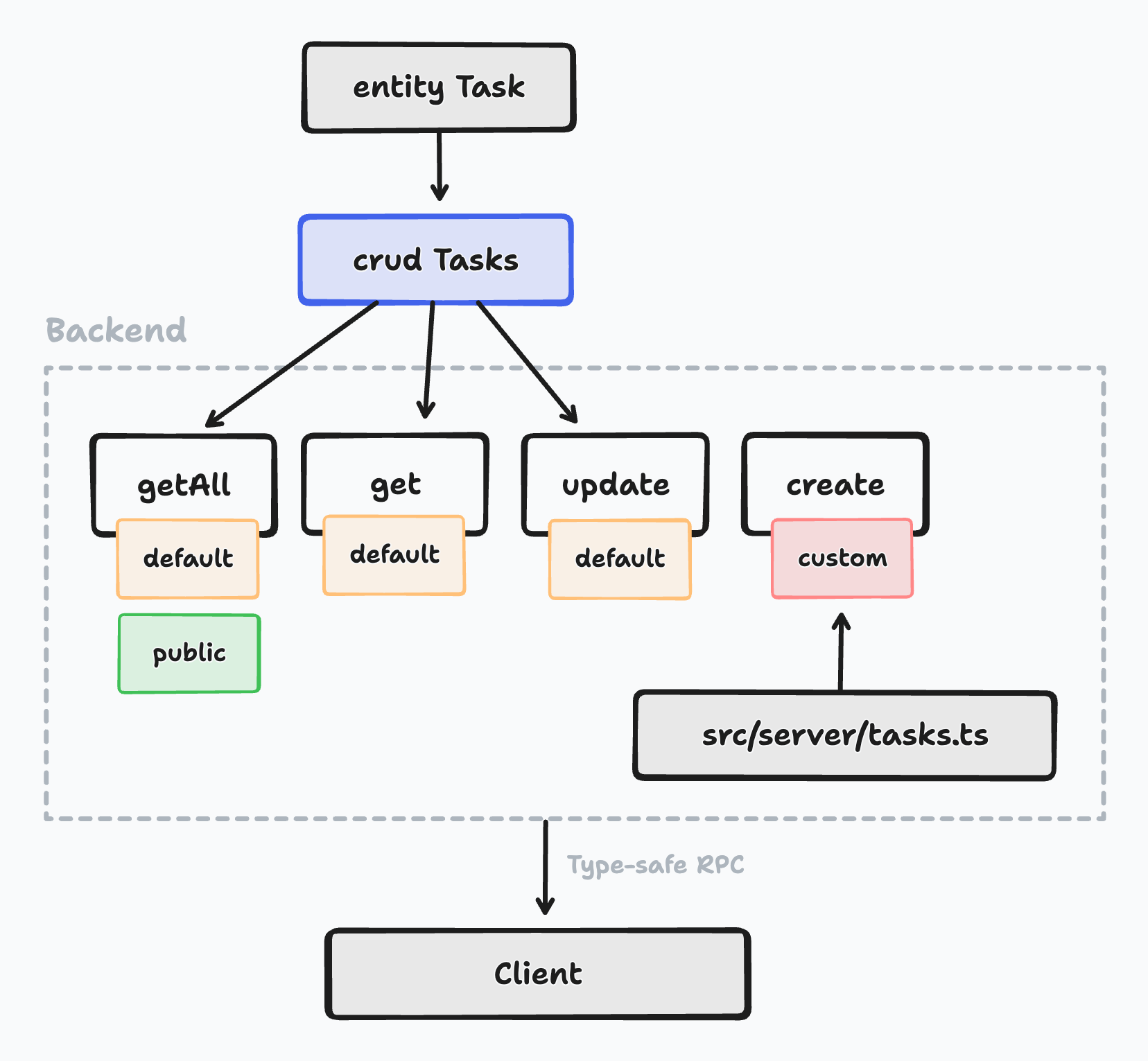 With a single declaration, you can tell Wasp to automatically generate server-side logic (i.e., Queries and Actions) for creating, reading, updating and deleting Entities. As you update definitions for your Entities, Wasp automatically regenerates the backend logic.